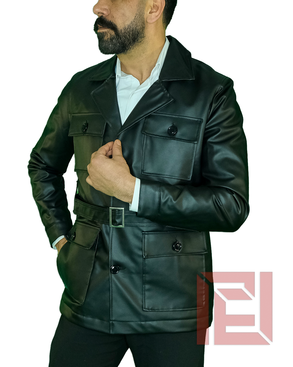 Modern tasarım anlayışını güçlü bir siluetle buluşturan siyah erkek deri ceket, keskin hatları ve fonksiyonel cep detaylarıyla dikkat çeken iddialı bir modeldir. Mat ve pürüzsüz deri yüzeyi sofistike bir görünüm sunarken; kemer detayı ve kapaklı büyük cepleri cekete karakteristik bir duruş kazandırır.